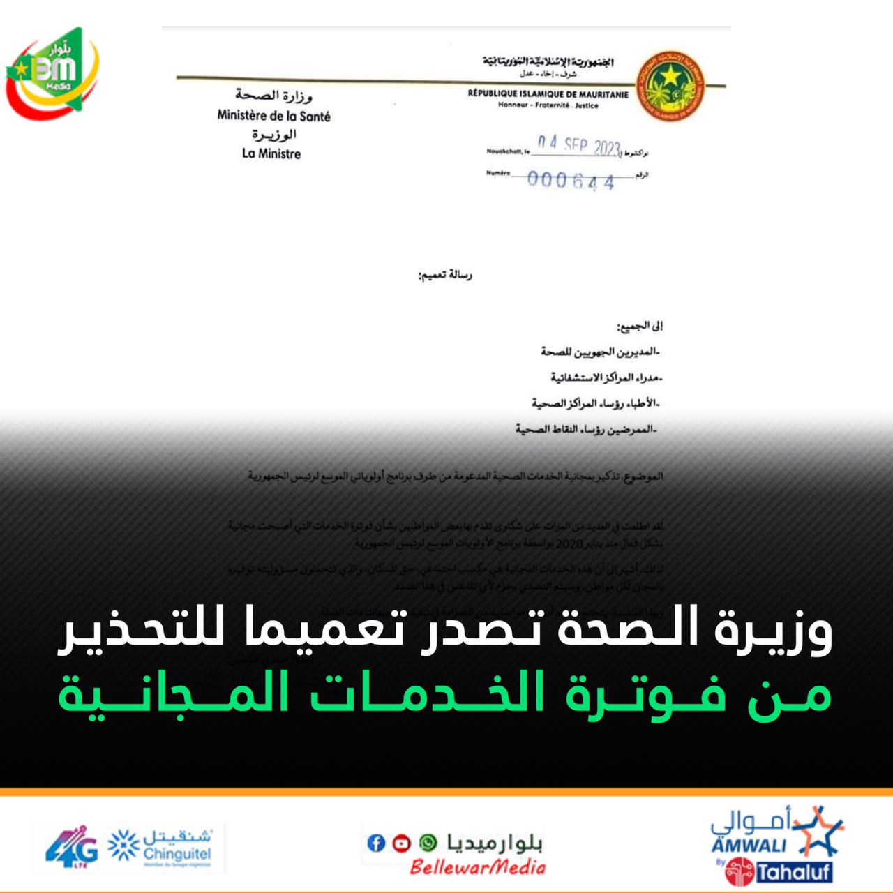 أصدرت وزيرة الصحة الناها بنت مكناس تعميما موجها إلى المديرين الجهوين للصحة والمراكز الاستشفائية والأطباء، حذرت فيه من فوترة الخدمات المجانية؛ مشيرة إلى أنه ستتم محاسبة كل من تقاعس في هذا الصدد.