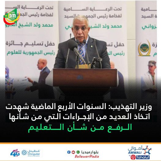 العديد من الإجراءات التي من شأنها الرفع من شأن التعليم.وأوضح خلال كلمة ألقاها مساء اليوم الثلاثاء خلال حفل تسليم جائزة رئيس الجمهورية للعلوم بالمركز الدولي للمؤتمرات في نواكشوط، “أن هذه الإجراءات شملت زيادة الرواتب والعلاوات والمعاشات زيادة معتبرة، وزيادة الفصول الدراسية والطاولات، واكتتاب 8000 من المعلمين والأساتذة ومقدمي الخدمات، وتوفير 3.2 مليون من الكتاب المدرسي، وتطور النفاذ للكفالات المدرسية من 63025 مكفولا سنة 2019 إلى 199337 مكفولا خلال السنة الدراسية 2022- 2023.”