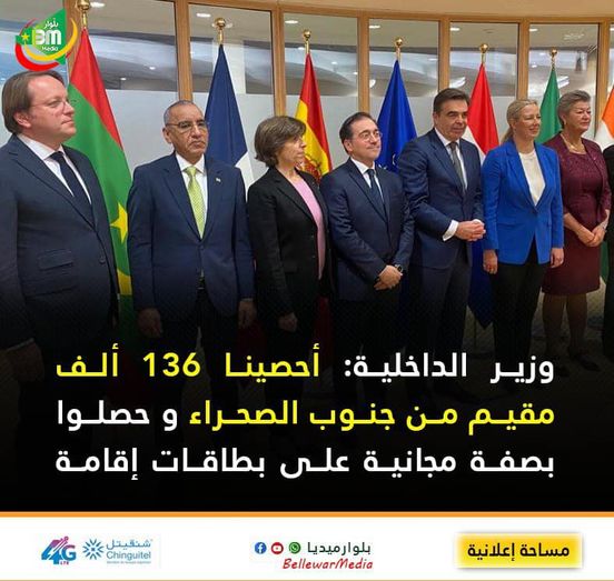 قال وزير الداخلية واللامركزية محمد أحمد ولد محمد الامين إن عدد الأجانب الذين تم إحصاؤهم حتى الآن من أجل حصولهم بصفة مجانية، على بطاقات إقامة بلغ 000 136 فردا من جنوب الصحراء.