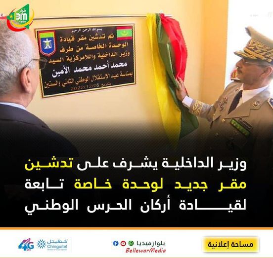 اشرف وزير الداخلية واللامركزية محمد أحمد ولد محمد الأمين رفقة قائد أركان الحرس الوطني محمد الشيخ محمد الأمين صباح اليوم الاثنين في مقاطعة عرفات على تدشين مقر جديد لوحدة خاصة تابعة لقيادة أركان الحرس الوطني مكونة من فصيلين إحداهما للتدخل والثاني للوجار.