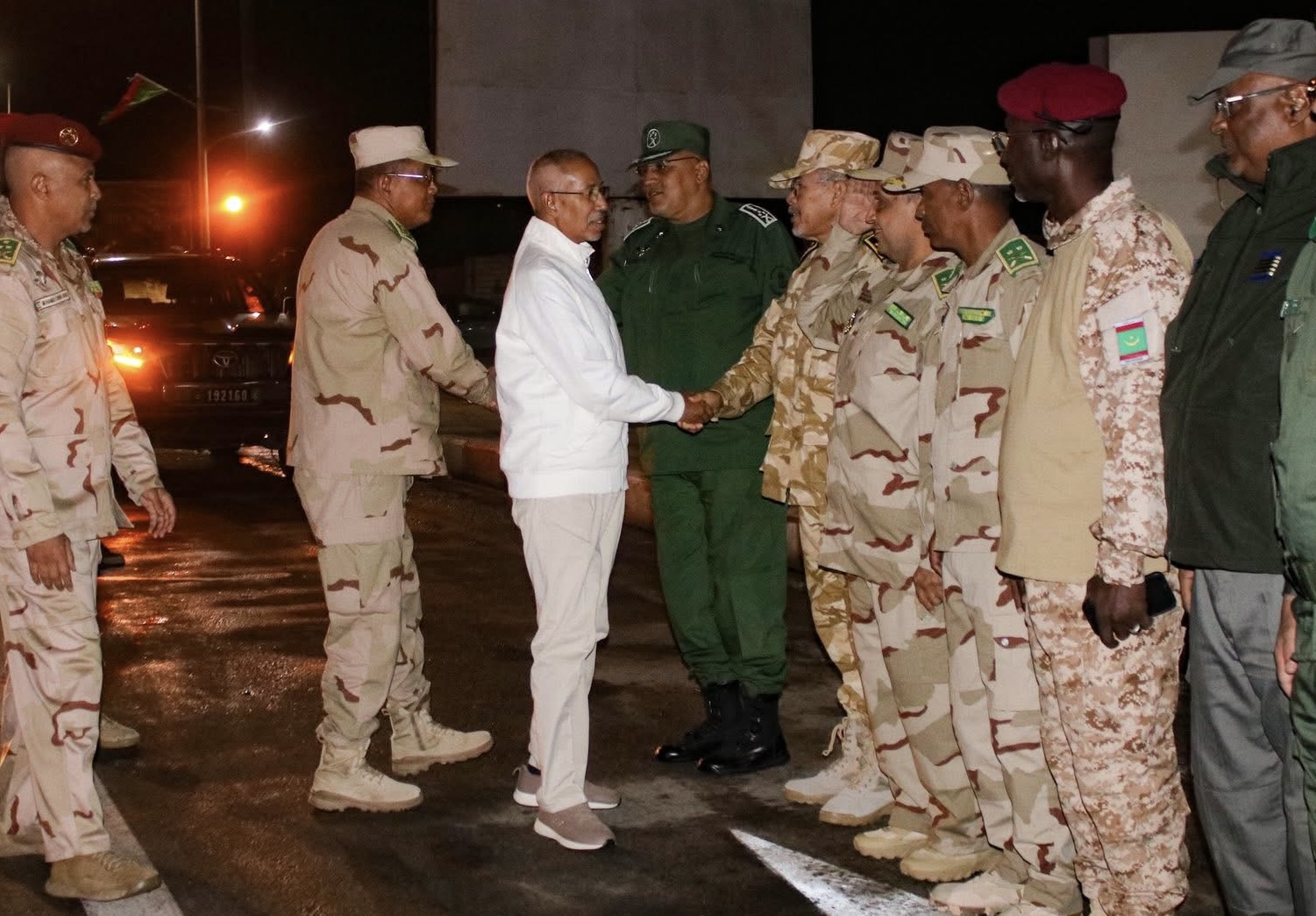 وحضر عملية التفقد عدد من كبار قادة الأجهزة العسكرية والأمنية، من بينهم قائد الأركان الخاصة لرئيس الجمهورية الفريق محمد المختار الشيخ مني، وقائد أركان الدرك الوطني الفريق أحمد محمود ولد الطايع، وقائد أركان البحرية الوطنية الفريق البحري أحمد السيد بنعوف، وقائد الجيش البري اللواء محمد الحافظ خطاري، وقائد القوات الخاصة اللواء محمد الأمين بلال، والمفتش العام للقوات المسلحة وقوات الأمن اللواء الحسن مكت، إضافة إلى قائد أركان الحرس الوطني المساعد العقيد الشيخ عابدين معييف، وعدد من قادة الفرق والمديريات في الأركان العامة للجيوش.