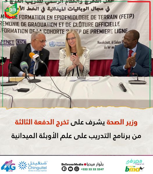 أشرف ووزير الصحة المختار ولد داهي،رفقة السفيرة الأمريكية ببلادنا،صباح اليوم الجمعة على حفل تخرج 22 مشاركًا من الدفعة الثالثة من برنامج التدريب على علم الأوبئة الميدانية.