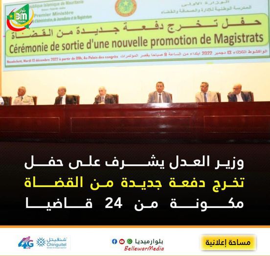 أشرف وزير العدل محمد محمود بن الشيخ عبد الله بن بيه صباح اليوم الثلاثاء بالمركز الدولي للمؤتمرات بنواكشوط على حفل تخرج دفعة جديدة من القضاة أكملت دراستها وتكوينها بالمدرسة الوطنية للادارة والصحافة والقضاء.
