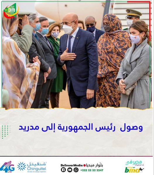 وصل فخامة رئيس الجمهورية، السيد محمد ولد الشيخ الغزواني، مساء اليوم الأربعاء إلى مدريد في مستهل زيارة رسمية للمملكة الإسبانية تدوم ثلاثة ايام.