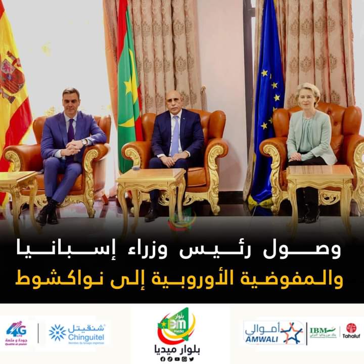وصل اليوم الخميس إلى مطار نواكشوط الدولي “أم التونسي” ، رئيس الوزراء الإسباني بيدرو سانشيز، ورئيسة المفوضية الأوروبية أورسولا فون دير لاين، في إطار زيارة عمل لموريتانيا.
