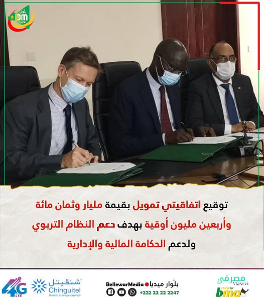 وقع وزير الشؤون الاقتصادية وترقية القطاعات الإنتاجية ظهر اليوم بنواكشوط أوسمان مامودو كان رفقة سفير الاتحاد الأوروبي، على اتفاقيتي تمويل هبة بغلاف مالي يبلغ سبعة وأربعون مليون وستمائة وثمانون ألف (47.680.000) أورو، أي ما يعادل حوالي مليار وثمان مائة وأربعين مليون (1.840.000.000) أوقية جديدة