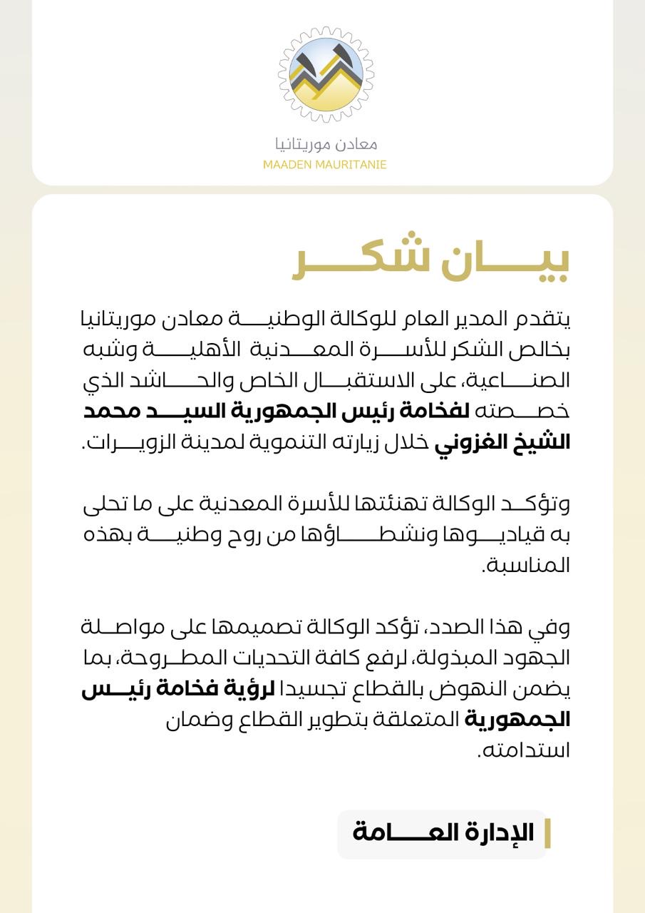 أعرب المدير العام للوكالة الوطنية معادن موريتانيا عن خالص شكره للأسرة المعدنية، بمكونيها الأهلي وشبه الصناعي، على الاستقبال الحاشد الذي خصصته لرئيس الجمهورية محمد ولد الشيخ الغزواني خلال زيارته التنموية لمدينة الزويرات.