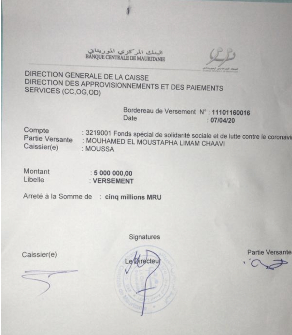 و كان الرئيس الموريتاني محمد ولد الغزواني قد تبرع براتب لثلاثة أشهر لصندوق “مساهماتي” و دعا الموريتانيين للتبرع لمواجهة وباءالكورونا.