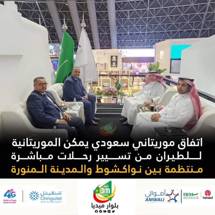 وفي هذا الإطار، اجتمع صباح الثلاثاء الماضي 09 يناير الجاري المدير العام المساعد للوكالة الوطنية للطيران المدني ANAC السيد باب أحمد ولد باب أحمد، والمدير العام للموريتانية للطيران MAI السيد أحمد سالم عمي في جلسة عمل بهذا الخصوص مع كل من السيدين عبد العزيز الدعيلج رئيس الهيئة العامة للطيران المدني السعودي، ونائبه التنفيذي للنقل الجوي والتعاون الدولي السيد علي بن محمد رجب بمدينة جدة، حيث تم خلال جلسة العمل هذه قبول الجانب السعودي تعيين الناقلة الجوية الوطنية “الموريتانية للطيران” لاستغلال حقوق النقل الجوي بين البلدين، وذلك عبر تنظيم رحلات جوية منتظمة بين البلدين الشقيقين.