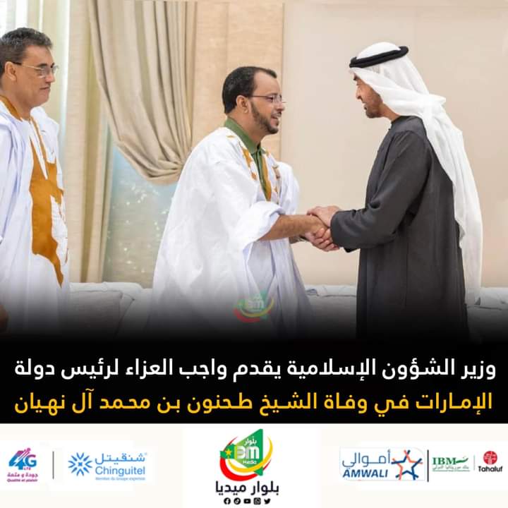 قدم وزير الشؤون الإسلامية والتعليم الأصلي الداه ولد سيدي ولد أعمر طالب، رفقة السفير الموريتاني بالإمارات أحمد سالم ولد محمد راره؛ واجب العزاء لرئيس دولة الإمارات العربية المتحدة الشيخ محمد بن زايد آل نهيان في وفاة الشيخ طحنون بن محمد آل نهيان.