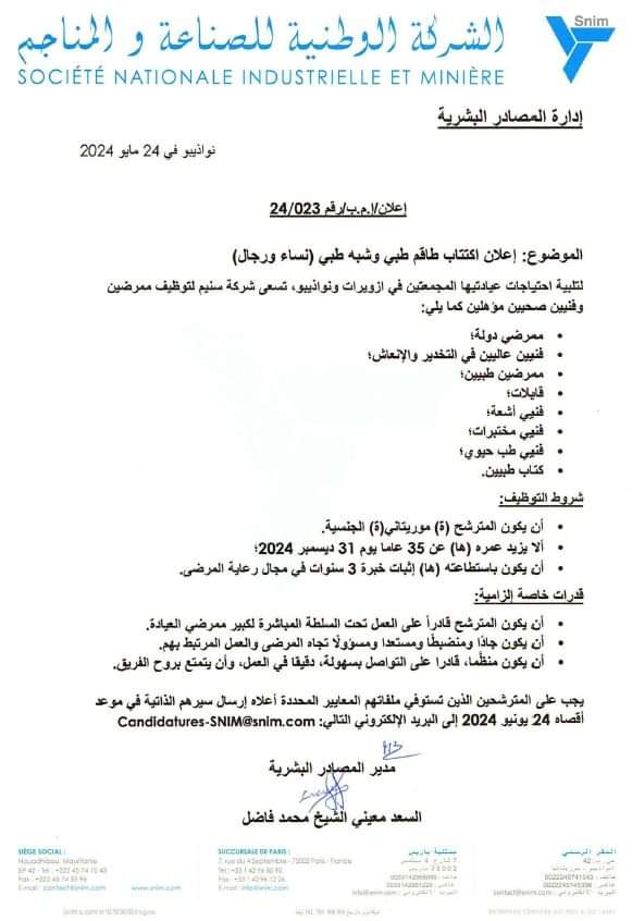 لتلبية احتياجات عيادتيها المجمعتين في ازويرات ونواذيبو، تسعى شركة سنيم لتوظيف ممرضين وفنيين صحيين مؤهلين كما يلي: