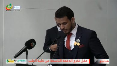 لحظة مؤثرة في حفل تخرج الدفعة التاسعة من كلية الطب اثناء كلمة طالب تونسي باسم الطلبة الأجانب