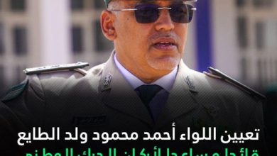 [ad_1] رئاسة الجمهورية تعلن أنه، بموجب مرسوم صادر اليوم الأربعاء، تم تعيين اللواء أحمد محمود ولد الطايع، قائدا مساعدا لأركان…