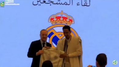 شاهد رئيس رابطة مشجعي ريال مدريد في موريتانيا يهدي الرئيس فلورنتينو بيريز دراعة في لقائه مع الروابط