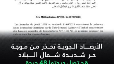 [ad_1] الأرصاد الجوية تحذر من موجة حر شديدة شمال البلاد قد تصل درجتها 48 درجة: أصدرت الهيئة الوطنية للأرصاد الجوية…