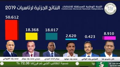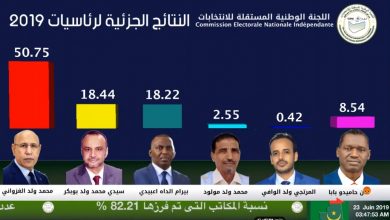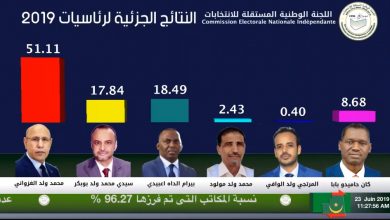 بعد فرز اكثر من 96% من المكاتب يتقدم محمد ولد الشيخ الغزواني: 51,11 % بيرام الداه اعبيد: 18,49% سيدي محمد…
