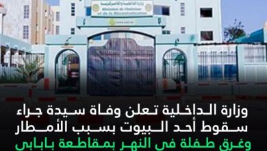 وزارة الداخلية تعلن وفاة سيدة جراء سقوط أحد البيوت بسبب الأمطار، وغرق طفلة في ال…