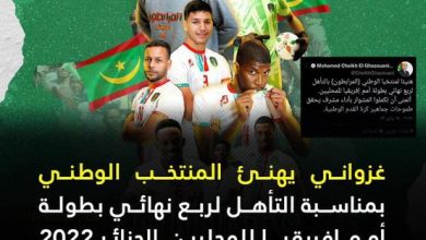 غزواني يهنئ المنتخب الوطني بمناسبة التأهل لربع نهائي بطولة أمم إفريقيا للمحليين …