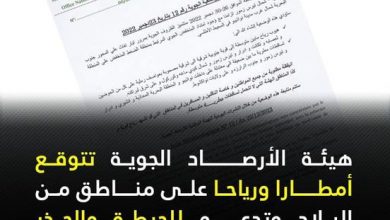 هيئة الأرصاد الجوية تتوقع أمطارا ورياحا على مناطق من البلاد وتدعو للحيطة والحذر …