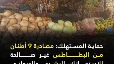 [ad_1] حماية المستهلك تعلن عن مصادرة 9 أطنان من البطاطس غير صالحة للاستهلاك البشري والحيواني خلال شهر نوفمبر المنصرم أعلنت…