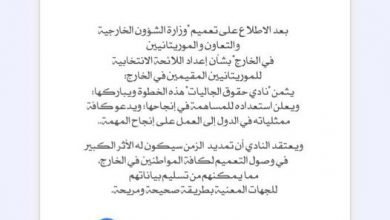 نادي حقوق الجاليات يثمن خطوة الخارجية بشأن إعداد اللائحة الانتخابية للموريتانيين…