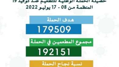 [ad_1] حصيلة الحملة الوطنية للتطعيم ضد كوفيد 19 المنظمة من 08 – 17 يوليو 2022 هدف الحملة 179509 مجموع المطعمين…