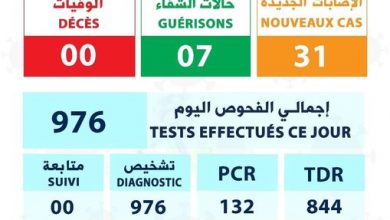 [ad_1] حالة اليوم الإصابات الجديدة: 31 حالات الشفاء: 07 حالات الوفاة: 00 —– مجموع الفحوص اليوم: 976 TDR: 844 PCR:…