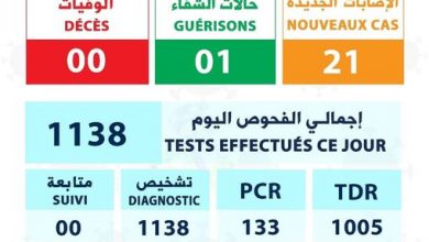 [ad_1] حالة اليوم الإصابات الجديدة: 21 حالات الشفاء: 01 حالات الوفاة: 00 —– مجموع الفحوص اليوم: 1138 TDR: 1005 PCR:…