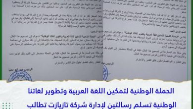 [ad_1] سلمت الحملة الشعبية للتمكين للغة العربية وتطوير لغاتنا الوطنية اليوم الاثنين 21 فبراير 2022 رسالتين لإدارة شركة تازيازت تطالب…