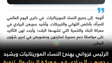 تقدم رئيس الجمهورية محمد ولد الشيخ الغزواني إلى جميع النساء الموريتانيات بأخلص التهاني والتبريكات في ذكرى اليوم العالمي للمرأة. وأشاد…