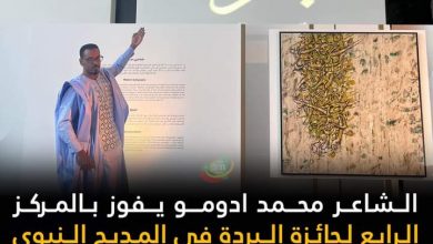 أعلِن في العاصمة الاماراتية أبوظبي عن فوز الشاعر محمد ولد أدومو بالمركز الرابع لجائزة البردة في مديح المصطفى صلى الله…
