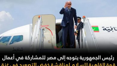 توجه رئيس الجمهورية محمد ولد الشيخ الغزواني، صباح اليوم الجمعة، إلى العاصمة المصرية القاهرة، للمشاركة في أعمال قمة “القاهرة للسلام…