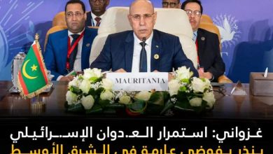 غزواني:استمرار العدوان الإسرائيلي على غزة ينذر بفوضى عارمة في الشرق الأوسط