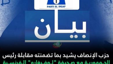 حزب الإنصاف يشيد بما تضمنته مقابلة رئيس الجمهورية مع صحيفة “لوفيغارو” الفرنسية
