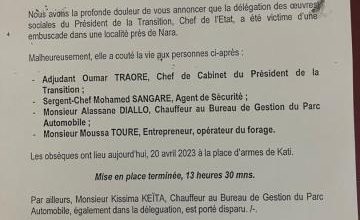 قالت الرئاسة المالية اليوم إن 4 من موظفيها من بينهم عمر تراوري مدير ديوان الرئيس الانتقالي عاصيمي غويتا قتلوا في…