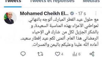 أعرب رئيس الجمهورية محمد ولد الشيخ الغزواني في تغريدة نشرها مساء الخميس، على “تويتر”، عن تهانيه لكافة الموريتانيين بمناسبة حلول عيد الفطر المبارك.…